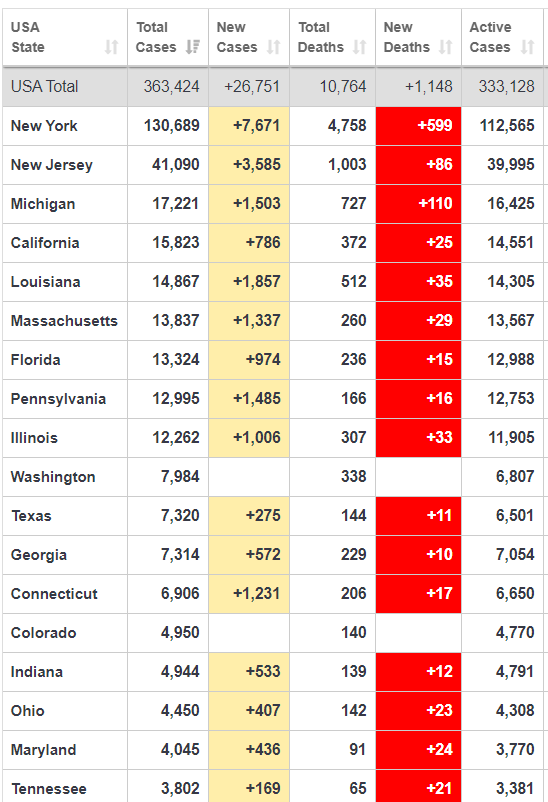 Coronavirus by the Numbers: U.S. Figures for Monday, April 6th Posted byDavid Lee MoserApril 6, 2020Posted in#corona, #coronavirus, #news, #virus Source: https://www.worldometers.info/coronavirus/country/us/ Rate this:Share this: Click to share on Facebook (Opens in new window) Facebook Click to share on X (Opens in new window) X Like Loading... Related Published by David Lee Moser I am a sixty-five year old semi-retired elementary teacher. View more posts