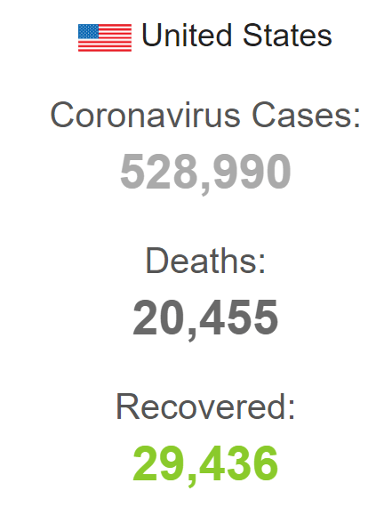 Coronavirus by the Numbers: U.S. Figures for Saturday, April 11th Posted byDavid Lee MoserApril 11, 2020Posted in#corona, #coronavirus, #news, #virus Rate this:Share this: Click to share on Facebook (Opens in new window) Facebook Click to share on X (Opens in new window) X Like Loading... Related Published by David Lee Moser I am a sixty-five year old semi-retired elementary teacher. View more posts