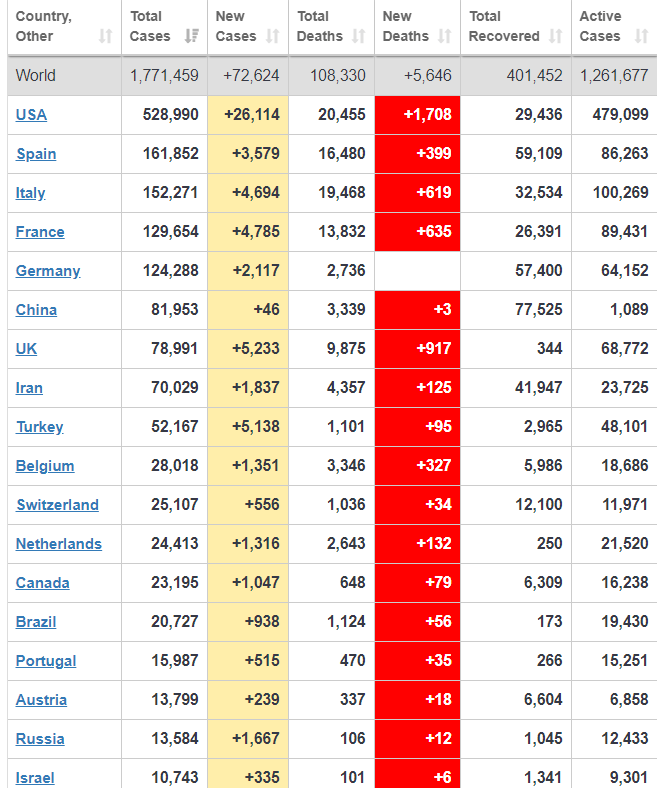 Coronavirus by the Numbers: World Figures for Saturday, April 11th Posted byDavid Lee MoserApril 11, 2020Posted in#corona, #coronavirus, #news, #virus Rate this:Share this: Click to share on Facebook (Opens in new window) Facebook Click to share on X (Opens in new window) X Like Loading... Related Published by David Lee Moser I am a sixty-five year old semi-retired elementary teacher. View more posts