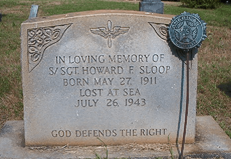 Several year ago, I dropped by a local historical cemetery and viewed some of the many tombstones of those who were buried there, including some of my relatives. During my search, I came upon a marker for someone I had not known, but it definitely had a story waiting to be told. The tombstone was for Staff Sergeant Howard Flake Sloop and what drew my attention was the inscription “Lost at Sea.” While I didn’t immediately do any research, I recently viewed the picture I had made and decided it was time to find out the details of his death.