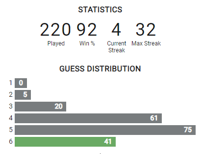 Day One – Wordle and Connections Posted byDavid Lee MoserFebruary 14, 2024Posted in#hiatus, #mystyle, #sabbatical, Connections, games, Wordle Wordle 970 6/6 ⬜⬜⬜⬜⬜⬜⬜🟨🟩⬜🟨⬜⬜🟩🟩⬜🟩🟩🟩🟩⬜🟩🟩🟩🟩🟩🟩🟩🟩🟩 ConnectionsPuzzle #248🟨🟨🟨🟩🟨🟩🟨🟩🟦🟨🟨🟩🟪🟨🟨🟨 Rate this:Share this: Click to share on Facebook (Opens in new window) Facebook Click to share on X (Opens in new window) X Like Loading... Related Published by David Lee Moser I am a sixty-five year old semi-retired elementary teacher. View more posts