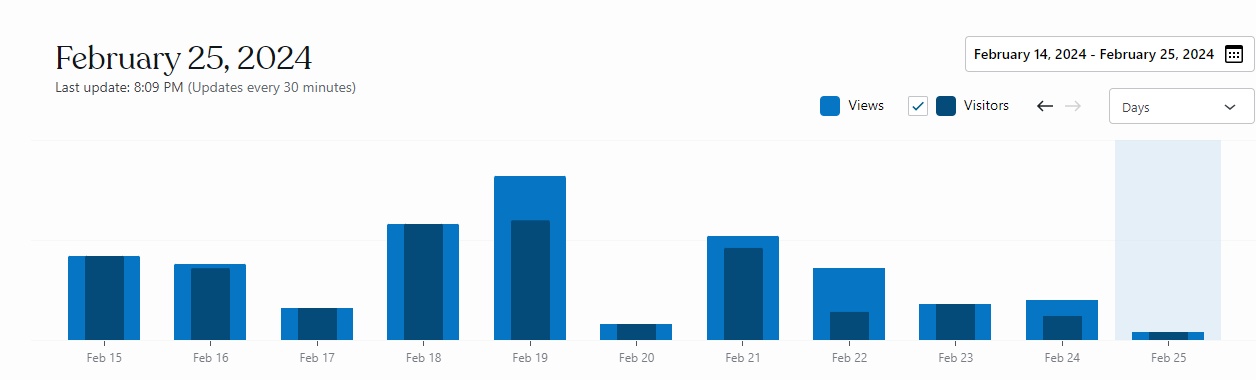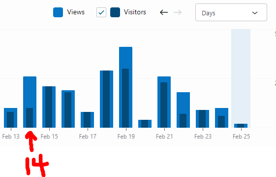 This first graph shows a number of daily visitors to my page. February 19th got the most visitors and views, with 41 views and 30 visitors. The day previous to that, February 18th got 29 visitors and 29 views.