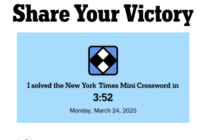 Daily Games for March 24th…. Posted byDavid Lee MoserMarch 24, 2025Posted inUncategorized Wordle 1374 3/6 π¨π¨π¨β¬β¬β¬π¨π¨π¨β¬π©π©π©π©π© Well Done! Strands #386βYes, Queen …β π‘ π‘ π‘ π‘ Nice job finding the theme words π΅Β and Spangram π‘. You usedΒ 4Β hintsΒ π‘. Rate this:Share this: Click to share on Facebook (Opens in new window) Facebook Click to share on X (Opens in new window) X Like Loading... Related Published by David Lee Moser I am a sixty-five year old semi-retired elementary teacher. View more posts