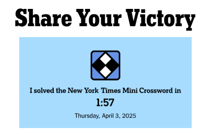 Daily Games for April 3rd… Posted byDavid Lee MoserApril 3, 2025Posted inUncategorized Wordle 1384 5/6 ⬜⬜🟩⬜⬜🟨⬜🟩⬜⬜🟩🟨🟩⬜⬜🟩⬜🟩🟨⬜🟩🟩🟩🟩🟩 Strands #396“Get the bug”💡🔵💡🔵🔵🔵🔵🔵🟡 Rate this:Share this: Click to share on Facebook (Opens in new window) Facebook Click to share on X (Opens in new window) X Like Loading... Related Published by David Lee Moser I am a sixty-five year old semi-retired elementary teacher. View more posts