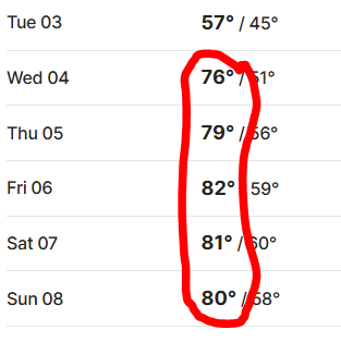 And one takes a look at the forecast for the rest of this week…by the end of the week we’ll be seeing our first eighty-plus-degree readings for the year…Quite a change from today’s temperatures. The roller coaster ride continues and there’s no exit available.